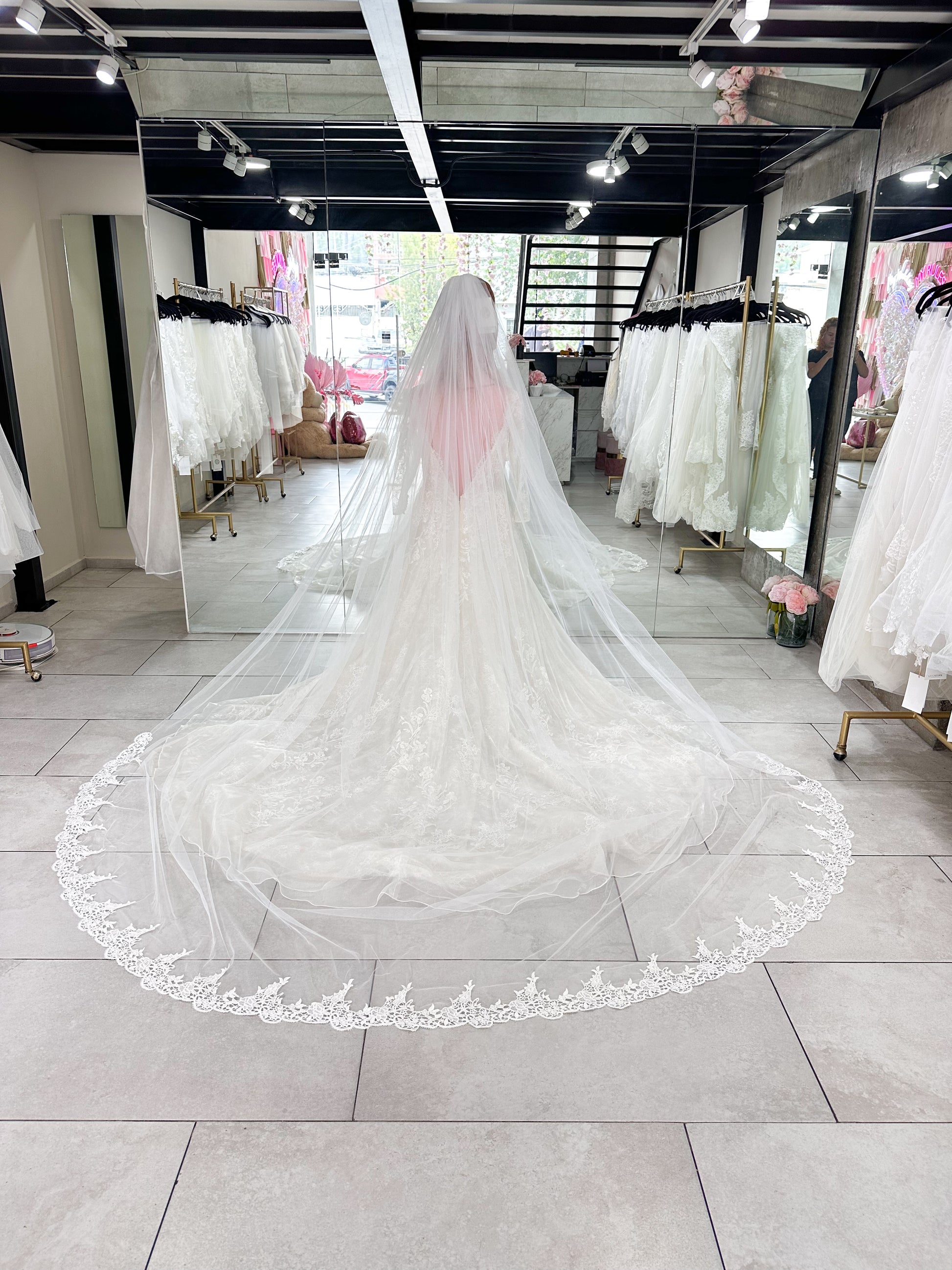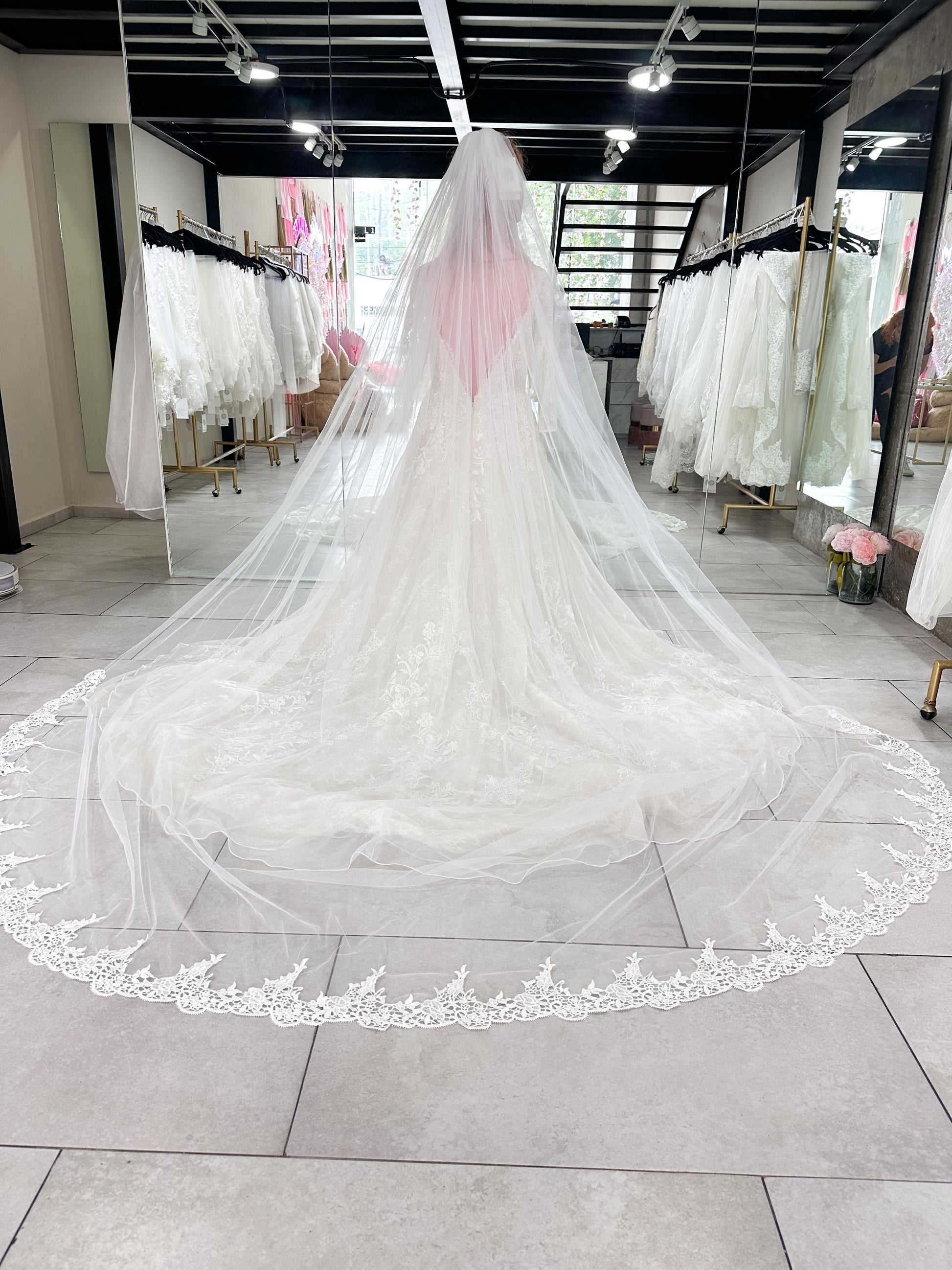 Tipo: Velo catedral de una capa con peineta, montada en tulle de novia con guipure mediano de flores y hojas al final para enmarcar vestidos clásicos románticos.